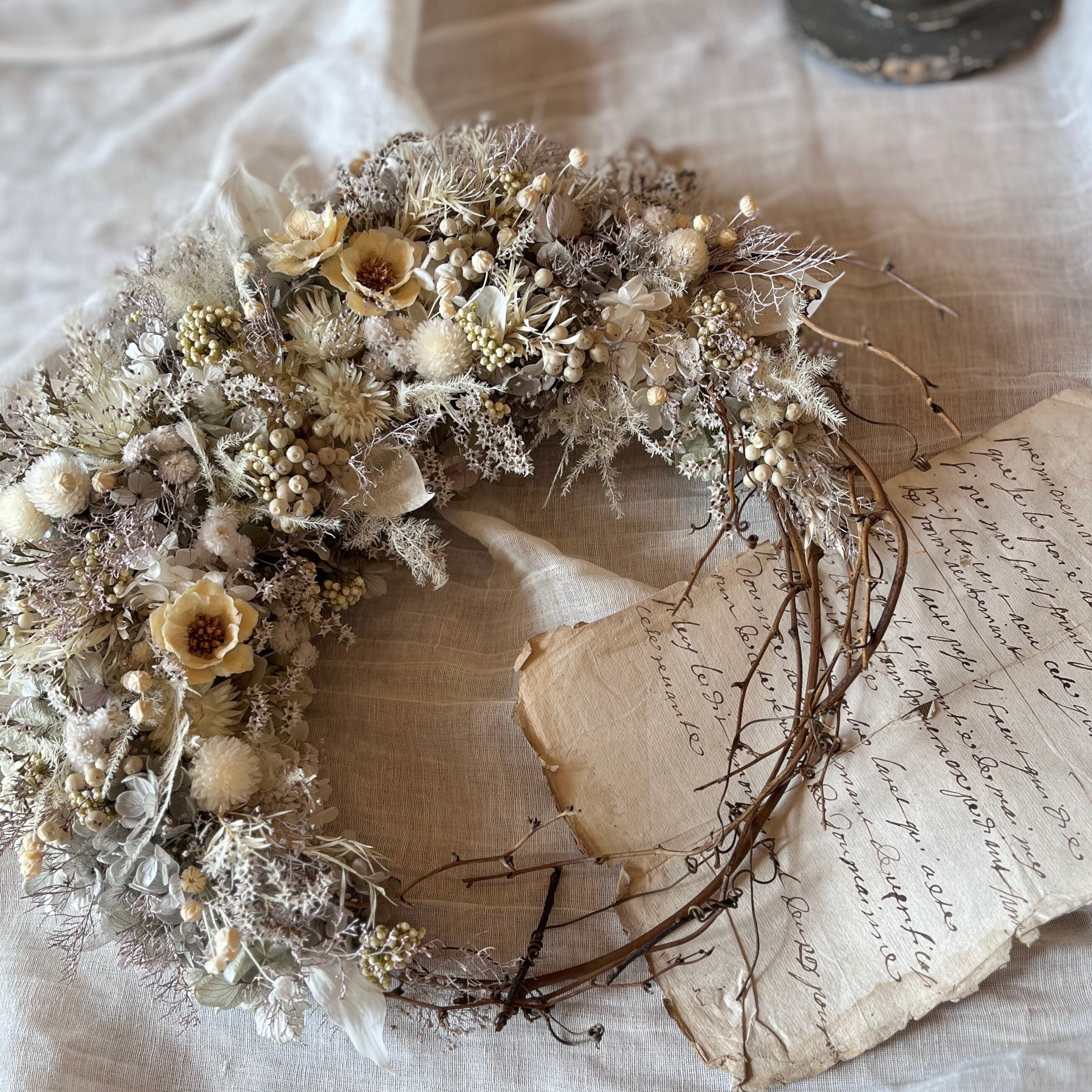 直径30cmほどのプリザーブドフラワーとドライフラワーのミックスリース。