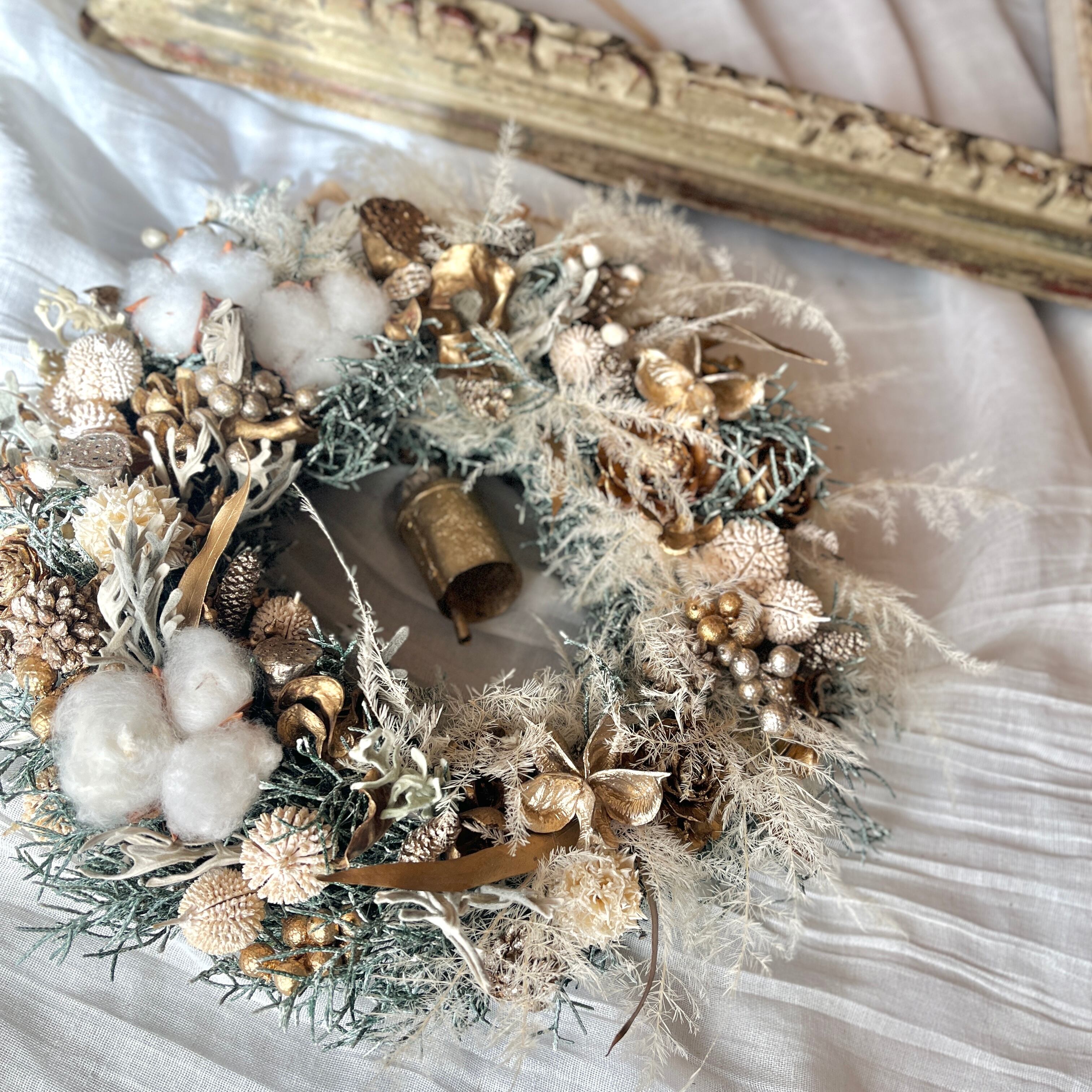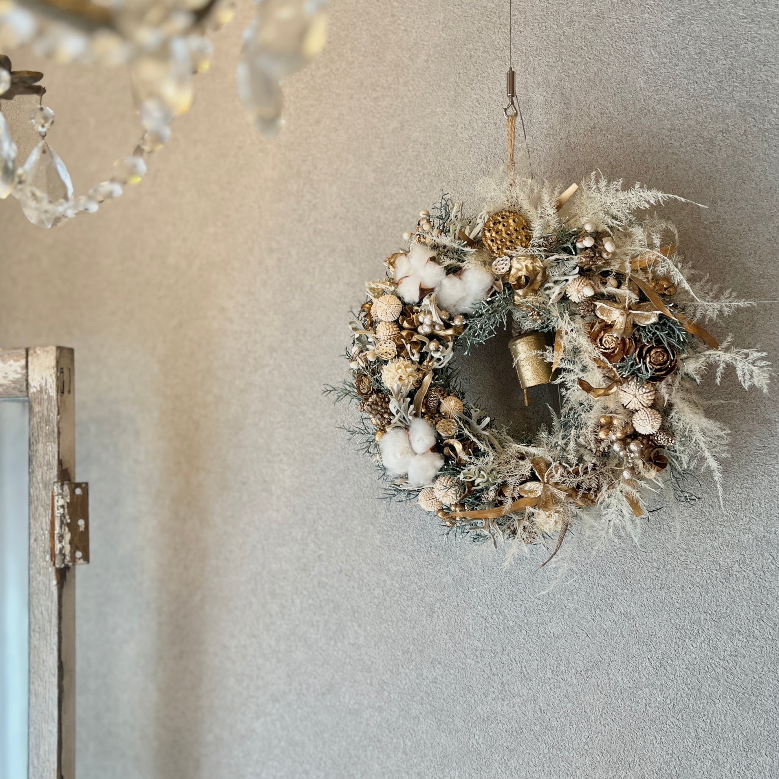【Christmas wreath】リース|ホワイト|アイボリー|white|gold|クリスマス|カウベル|コットンフラワー|エレガント|プリザーブド|プレゼント|ギフト|ラッピング無料|プリザ | プリザーブドフラワー専門店 Fleur・Pieces ドライフラワー