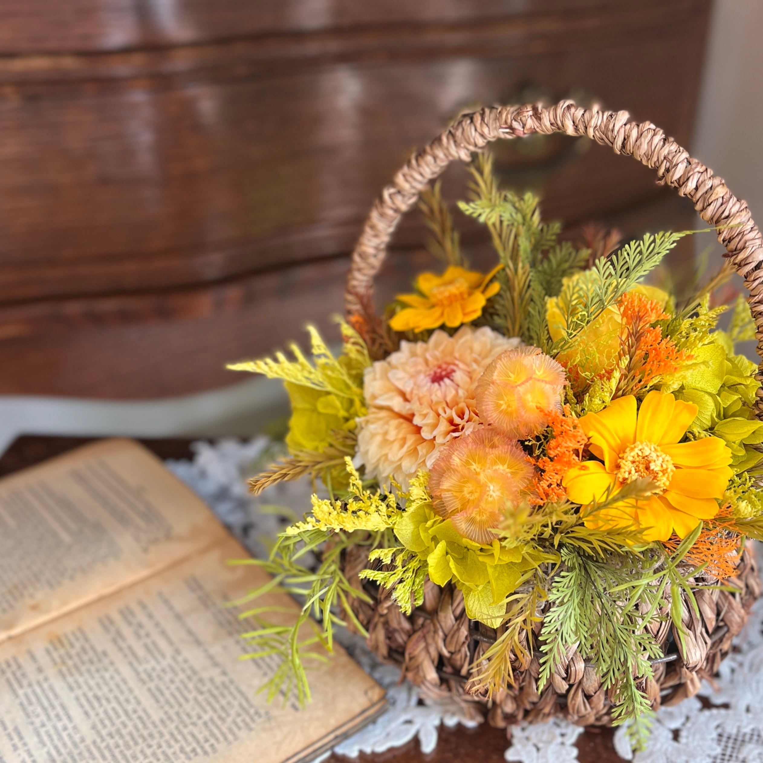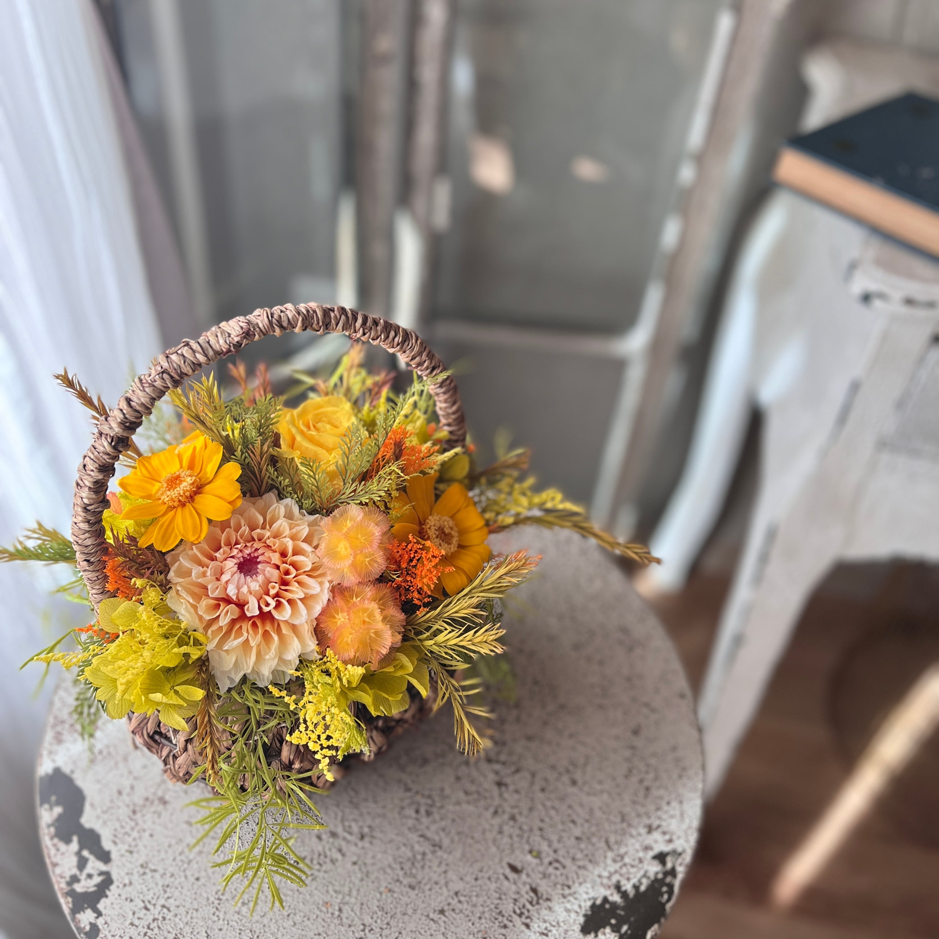 【プリザーブドフラワー】バスケット アレンジメント ダリア|イエロー|黄色|オレンジ|ナチュラル|グリーン|お誕生日|Birhtday|お見舞い|快気祝い|プレゼント|ギフト|ラッピング無料|プリザ | プリザーブドフラワー専門店 Fleur・Pieces ドライフラワー