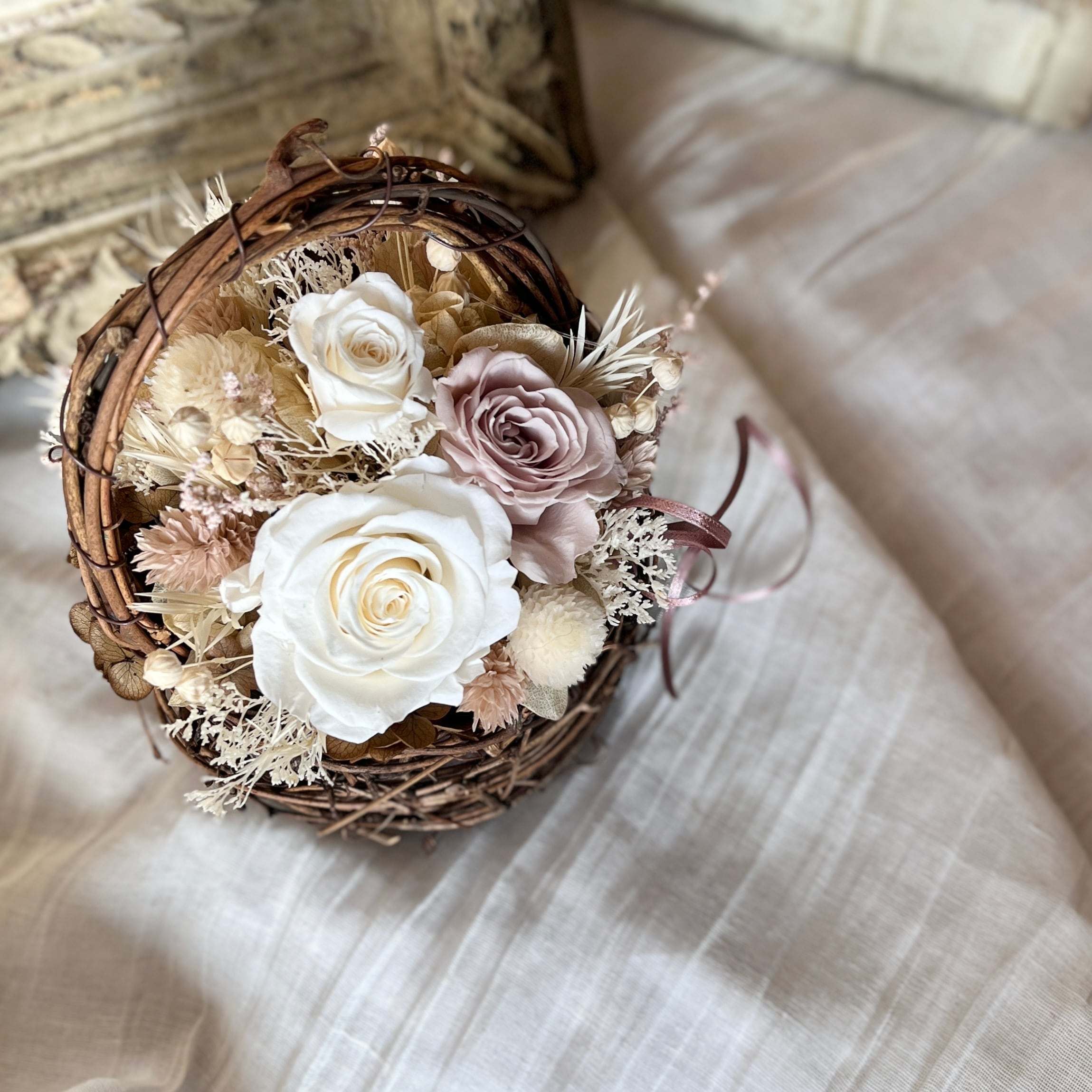 【プリザーブドフラワー】バスケット アレンジメント white|ivory|ベージュ|グレージュ|白|ニュアンス|くすみ|お誕生日|Birhtday|結婚祝い|出産祝い|開店祝い|サロン|ネイル|プレゼント|ギフト|ラッピング無料|プリザ | プリザーブドフラワー専門店 Fleur・Pieces ドライフラワー