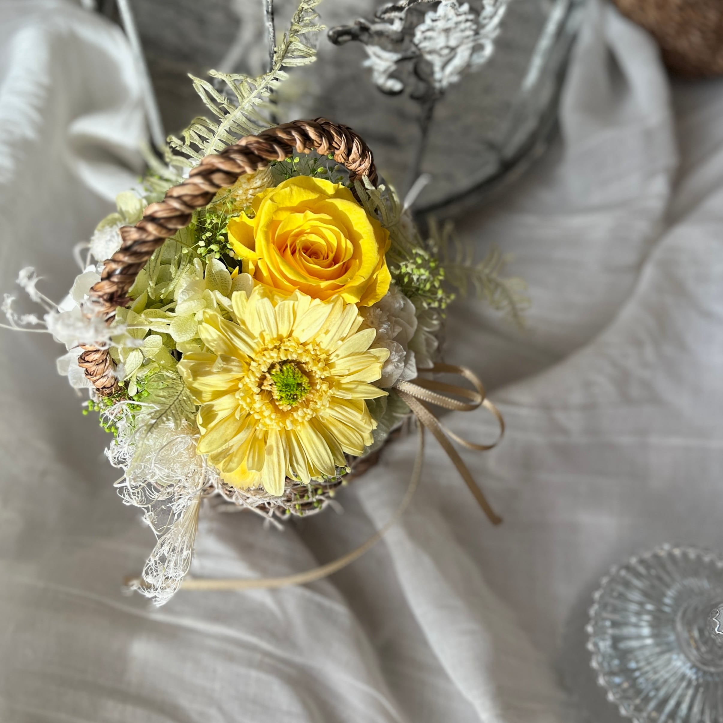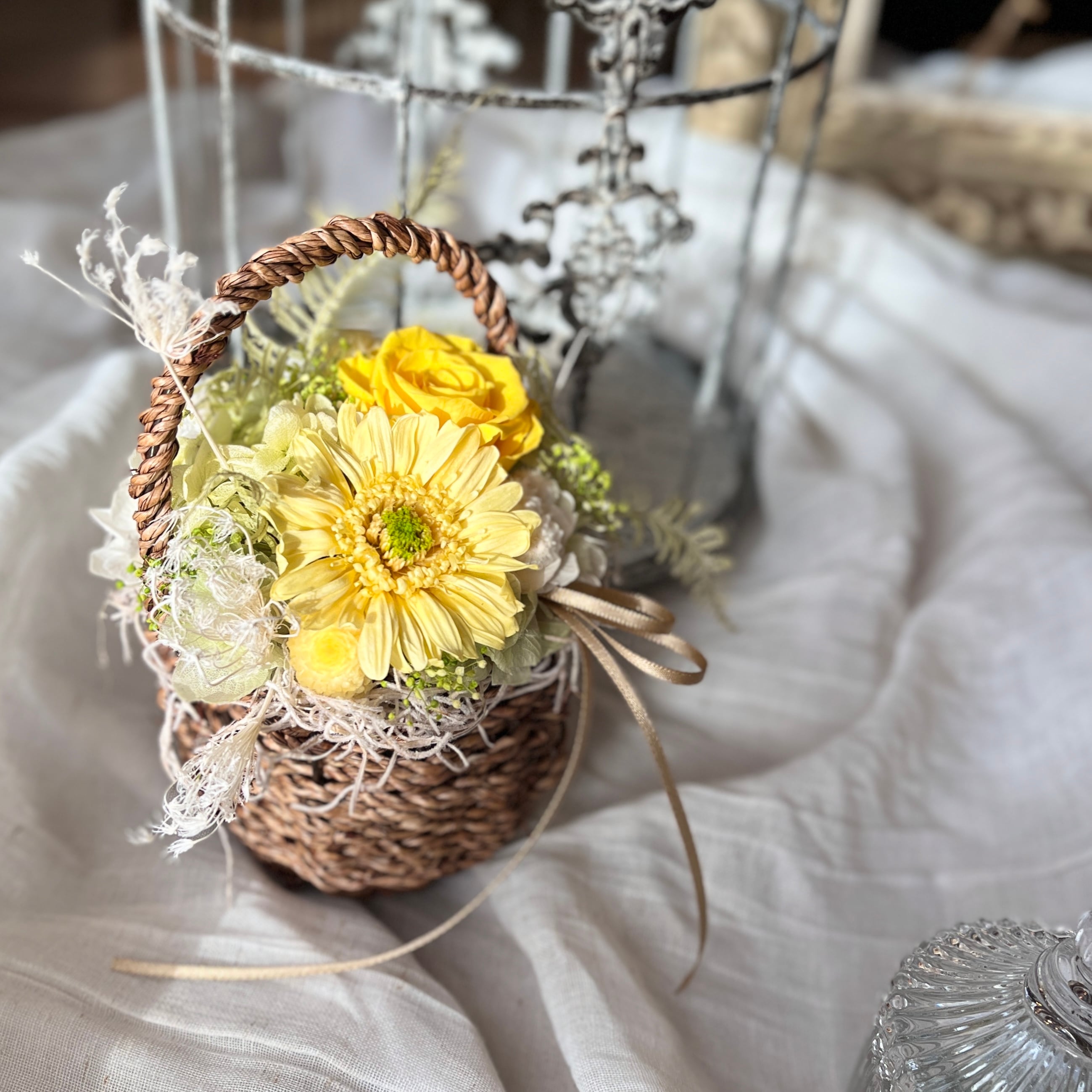 【プリザーブドフラワー】バスケット アレンジメント yellow|lemon|黄色|レモンイエロー|ガーベラ|バラ|お誕生日|Birhtday|出産祝い|開店祝い|記念日|お見舞い|病院|施設|プレゼント|ギフト|ラッピング無料|プリザ | プリザーブドフラワー専門店 Fleur・Pieces ドライフラワー