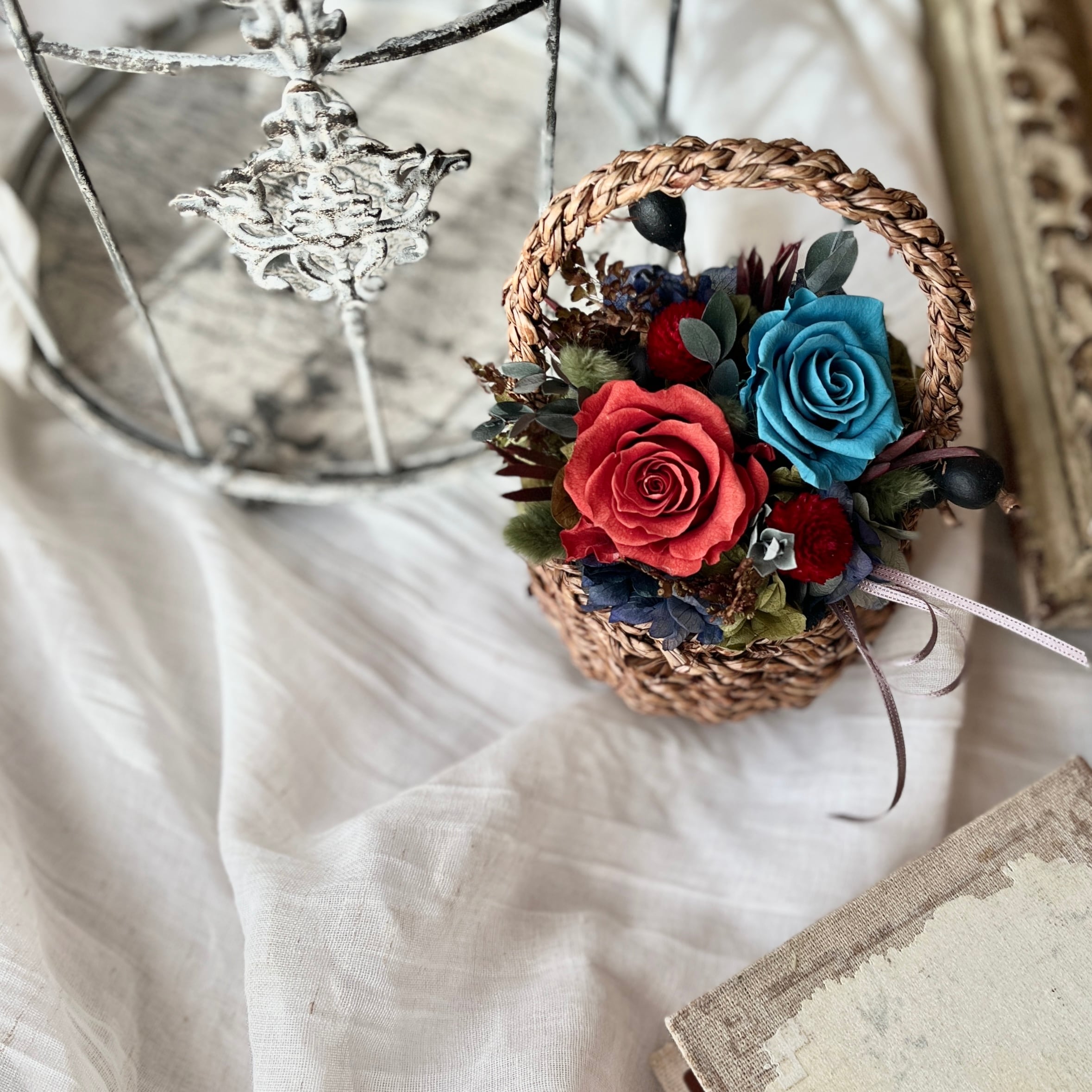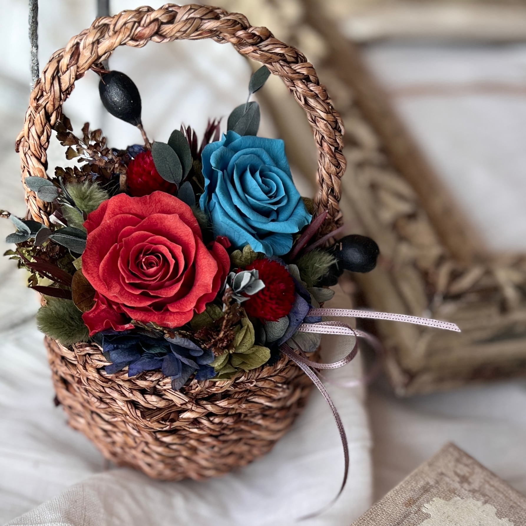 【プリザーブドフラワー】バスケット アレンジメント blue|red|青|テラコッタ|お誕生日|Birhtday|お祝い|開店祝い|記念日|クリスマス|プレゼント|ギフト|ラッピング無料|プリザ | プリザーブドフラワー専門店 Fleur・Pieces ドライフラワー