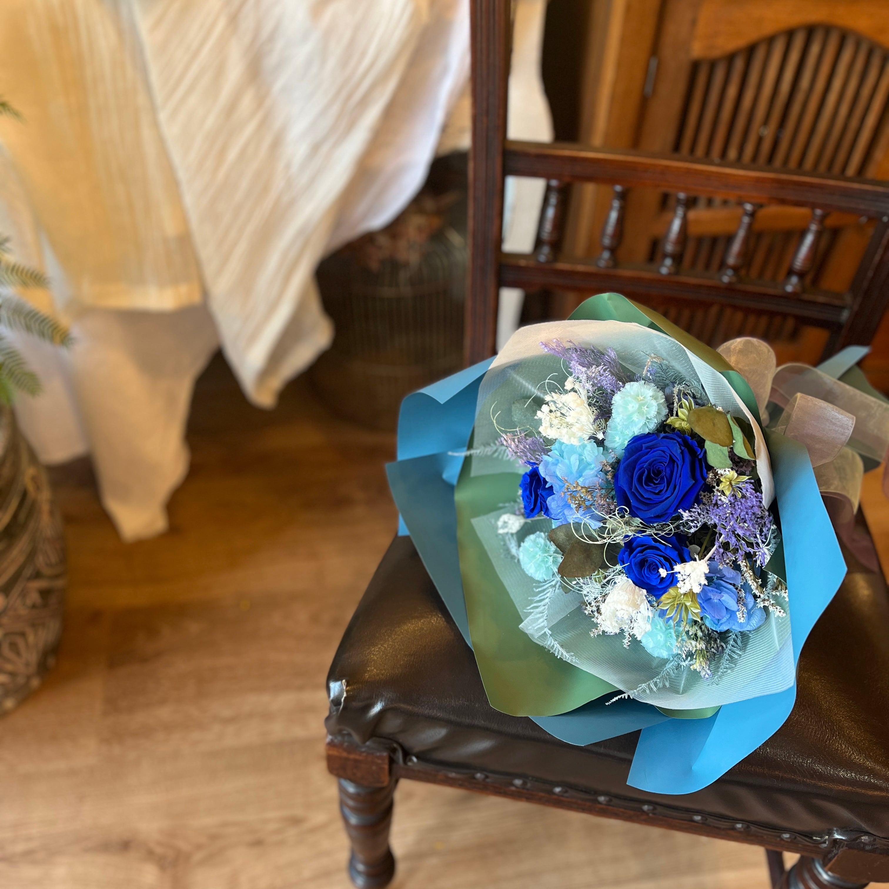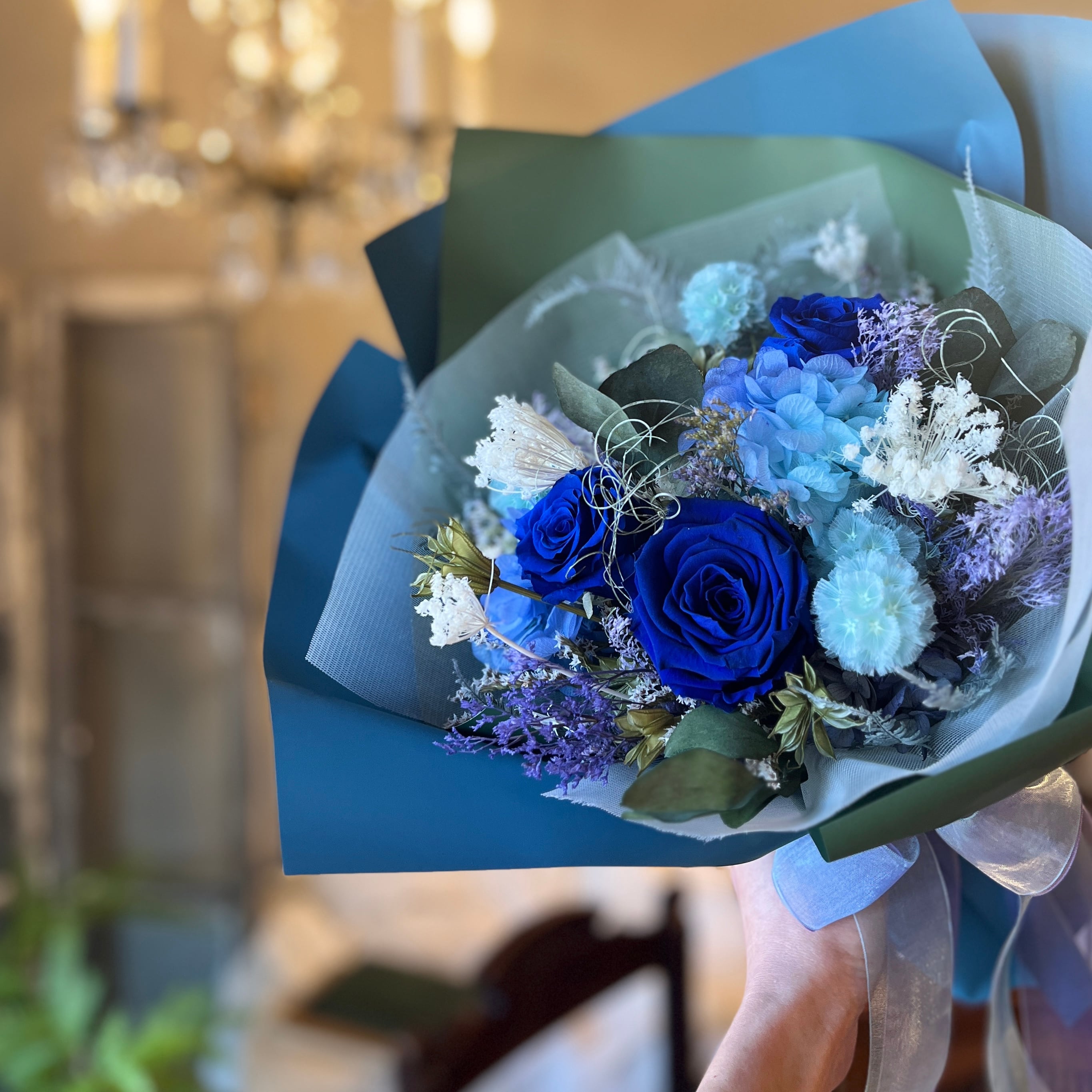 【プリザーブドフラワー】花束 bouquet|ブーケ|blue|青|水色|青いバラ|ロイヤルブルー|リボン|ブルーローズ|バースデー|プレゼント|フラワーギフト|結婚祝い|記念日|プロポーズ|お誕生日|御礼|サプライズ|プリザーブドフラワーブーケ|ラッピング無料|フラワーギフト
