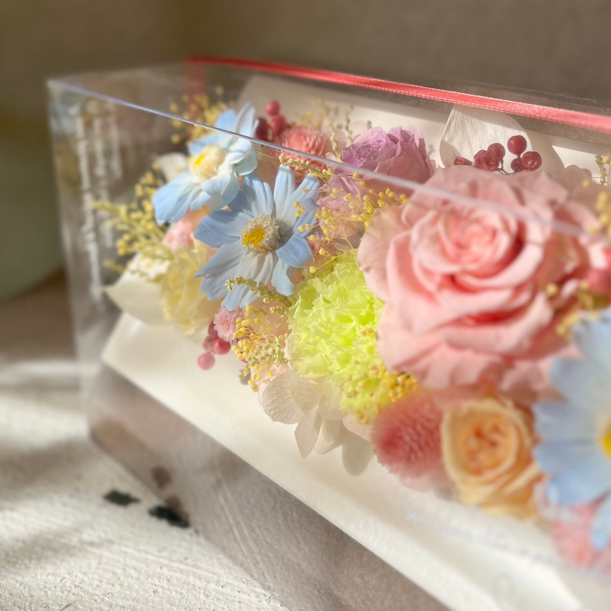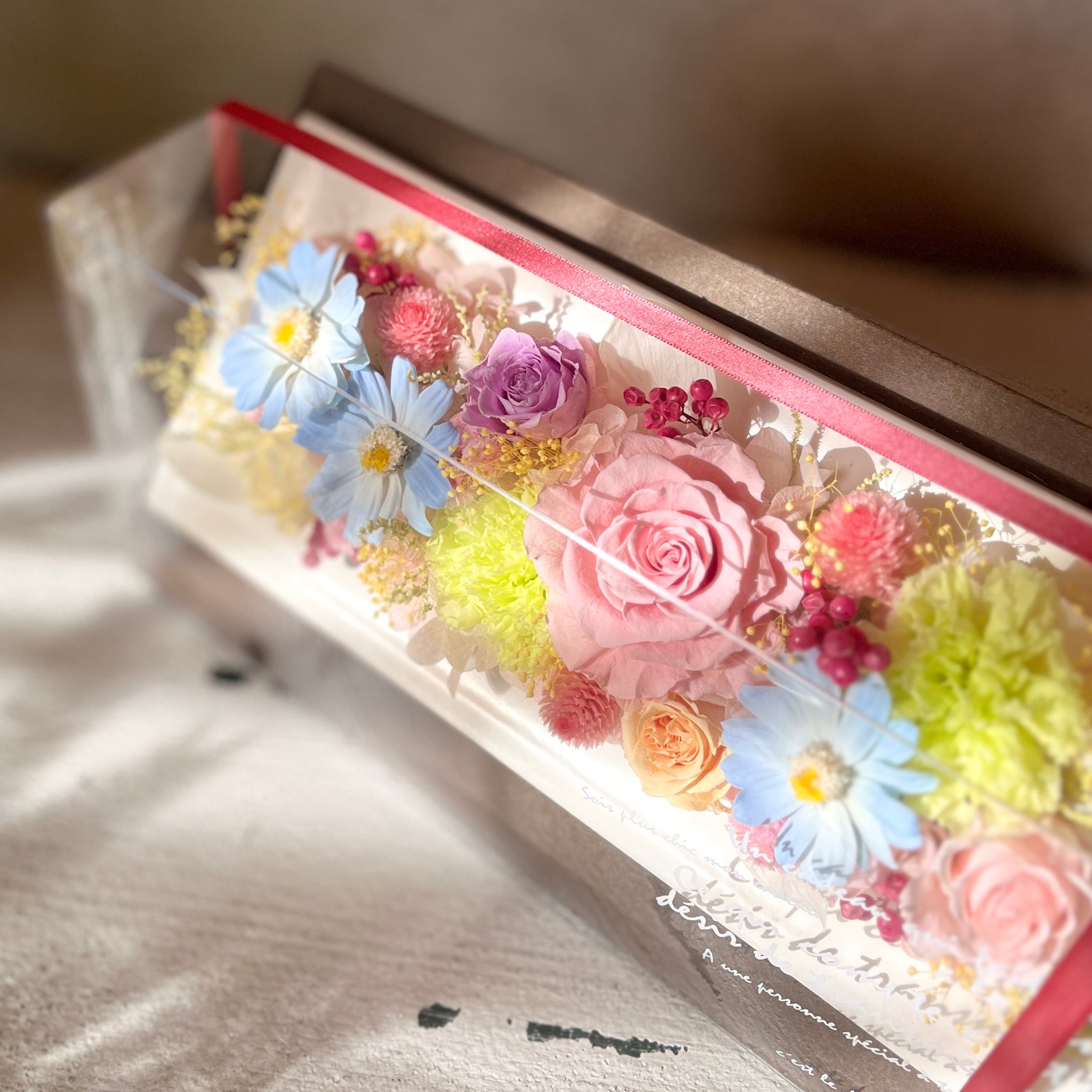 【プリザーブドフラワー】ウッドフレーム ケース入り Rectangle ホワイト|カラフル|ピンク|むらさき|水色|黄色|プリザ|退職祝い|就任祝い|お祝い|記念日|結婚祝い|開店祝い|ギフト|ラッピング無料|クリアケース|壁掛け|フレーム|アレンジメント|長方形