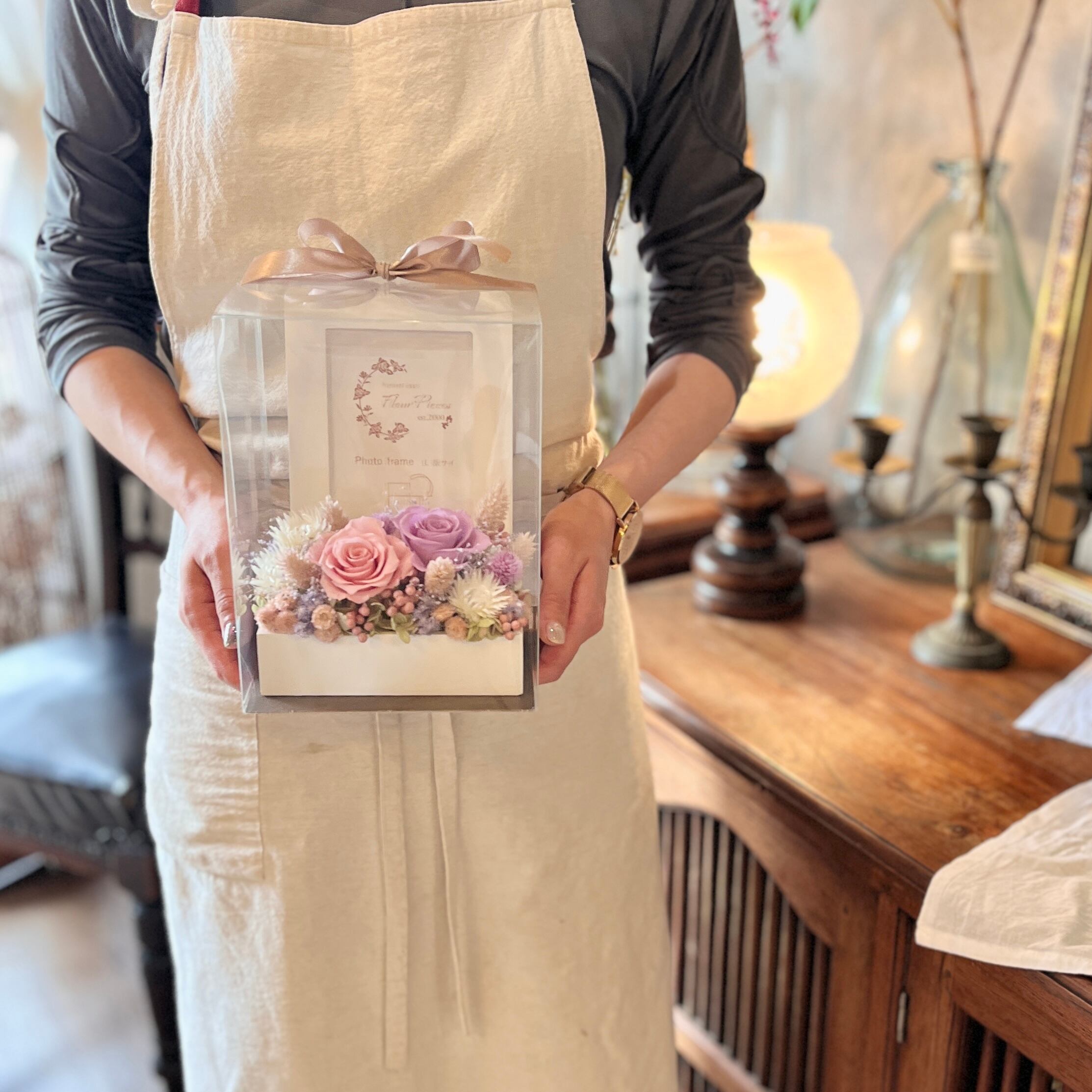 【プリザーブドフラワー】木製フォトフレーム プリザ|ローズ|ワイン|ピンク|パープル|紫|写真立て|フォトフレーム|お誕生日|古希|喜寿|長寿のお祝|記念品|プレゼント|メッセージカード|ギフト|ラッピング無料|フレーム|アレンジメント