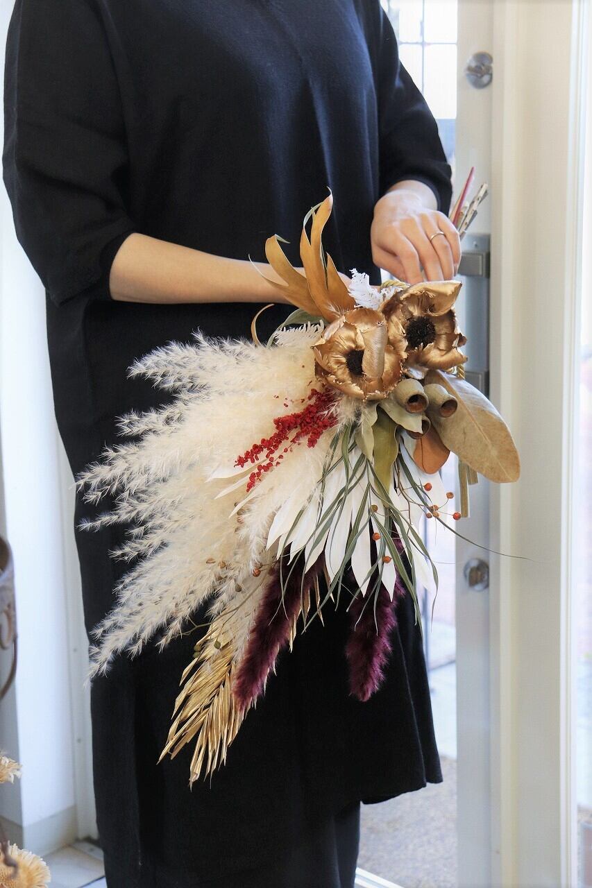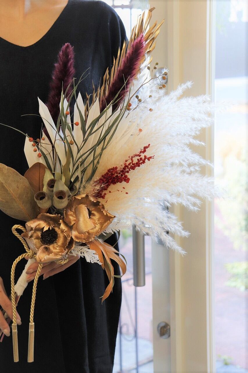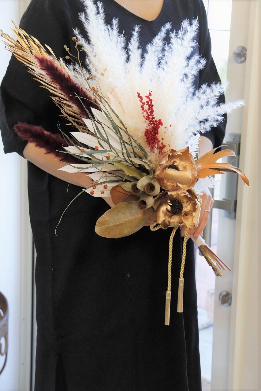ホワイトベースに赤とゴールドが入った和ブーケです。